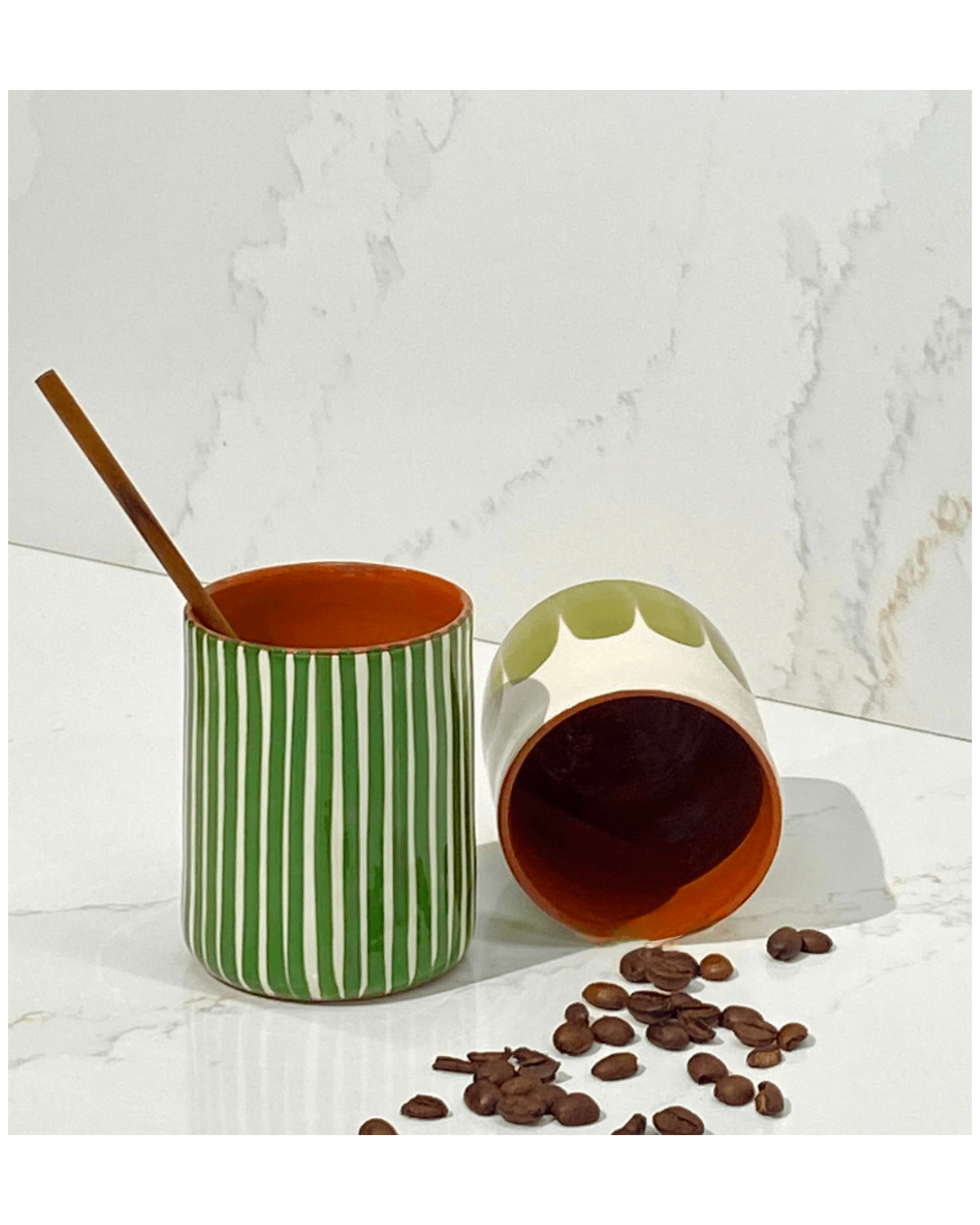 Tasse en céramique fabriquée et peinte à la main par des artisans potiers au Portugal. L'intérieur est en terre crue ocre émaillée transparente.