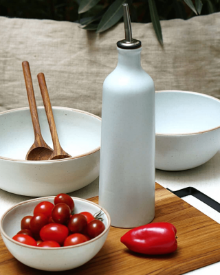 Craquez pour cet huilier en grès naturel au design épuré. Son anneau signature allie style et praticité pour un usage au quotidien.