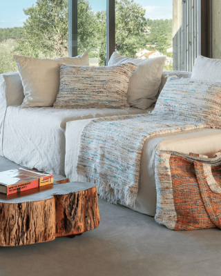 Le coussin TOGO, avec son tissage manuel, joue sur les textures pour créer une ambiance chaleureuse et apaisante.