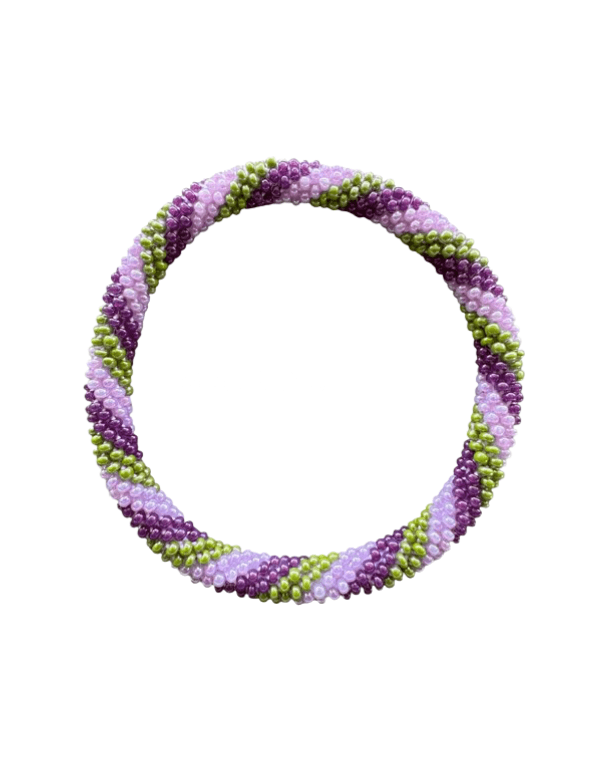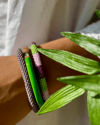Ce bracelet en perles de verre, entièrement réalisé à la main selon la technique traditionnelle du crochet.