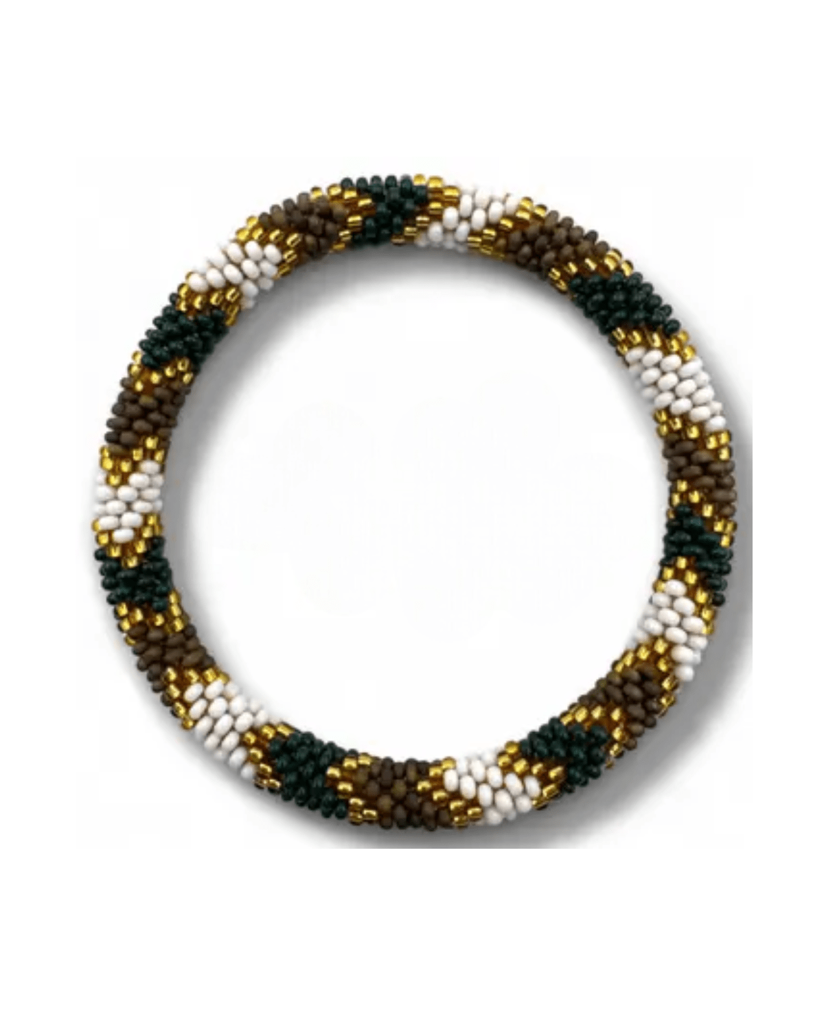 Ce bracelet en perles de verre, entièrement réalisé à la main selon la technique traditionnelle du crochet.