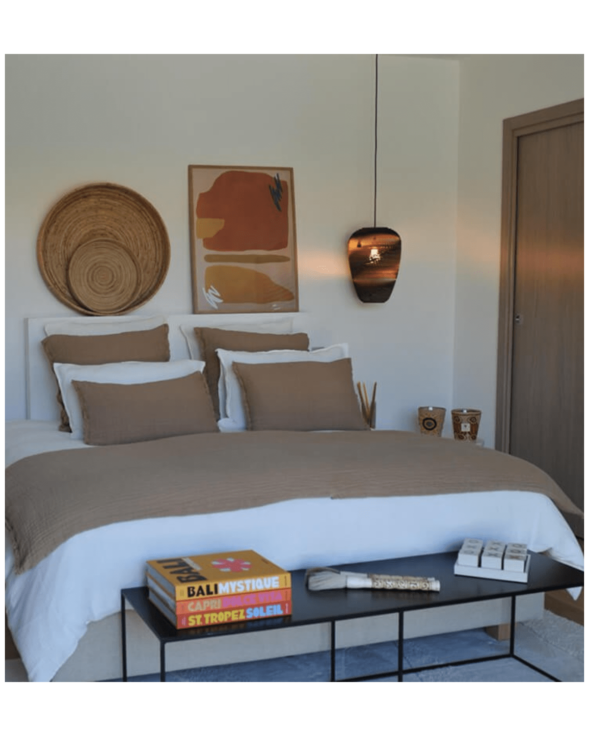 Avec les deux extrémités ornées de bords frangés, cet édredon apporte une touche bohème.