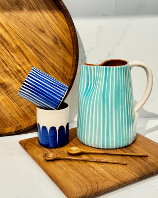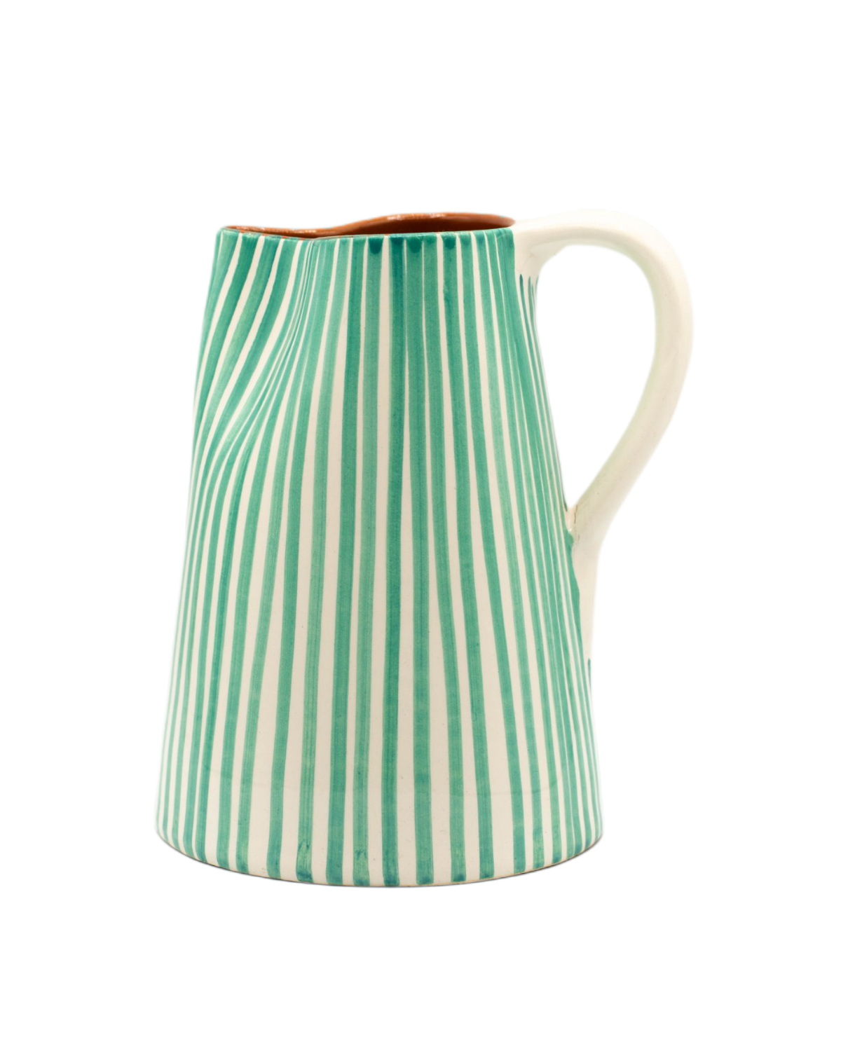 Ce joli pichet, façonné et peint à la main par des artisans potiers au Portugal, est un véritable objet décoratif et objet du quotidien. L’intérieur est en terre cuite ocre, émaillée transparente.