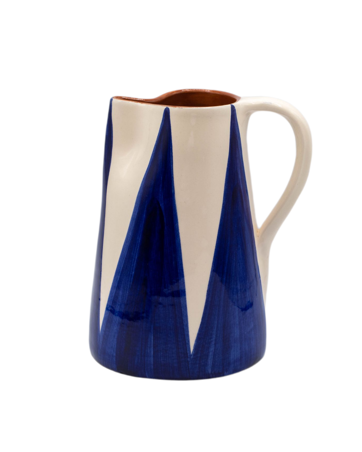 Ce joli pichet, façonné et peint à la main par des artisans potiers au Portugal, est un véritable objet décoratif et objet du quotidien. L’intérieur est en terre cuite ocre, émaillée transparente.