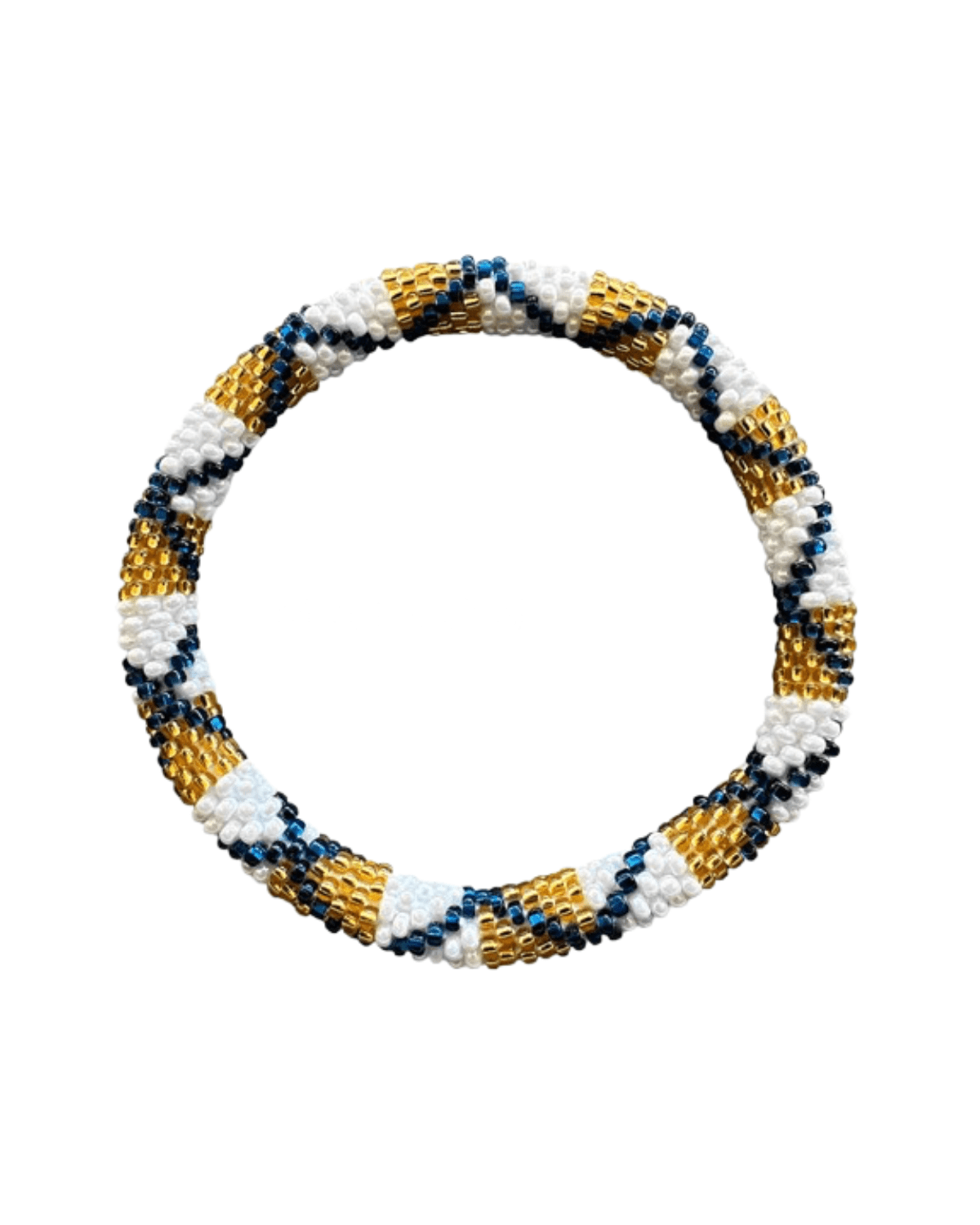 Ce bracelet en perles de verre, entièrement réalisé à la main selon la technique traditionnelle du crochet.