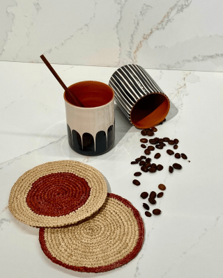 De quoi habiller et protéger vos tables et vos nappes avec du style: dessous de verre ou dessous de bouteille en raphia naturel tissé à main. On craque pour son coté tout doux et la petite fantaisie avec la couleur.